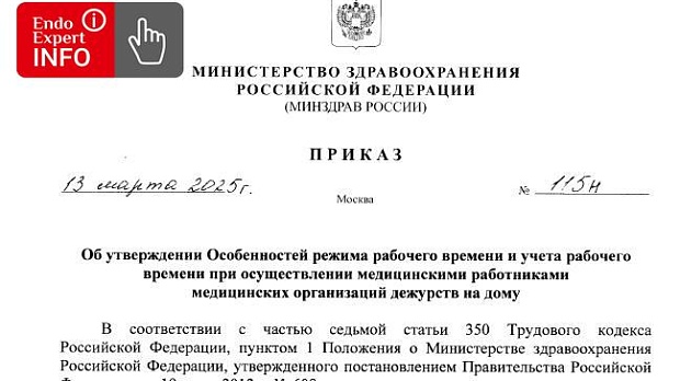 Документы и приказы: Приказ Минздрава РФ от 13.03.25 № 115н "Об утверждении Особенностей режима рабочего времени и учета рабочего времени при осуществлении медицинскими работниками медицинских организаций дежурств на дому"