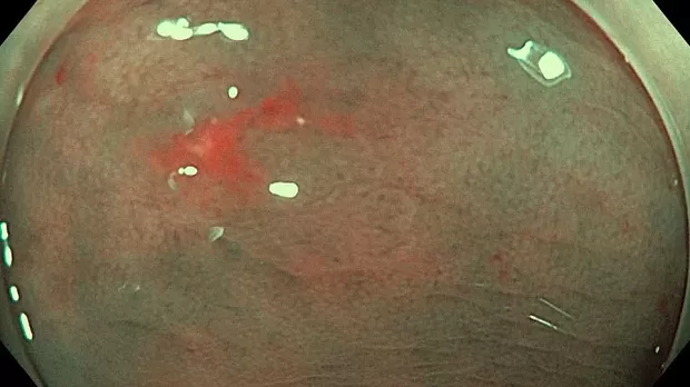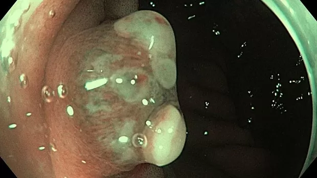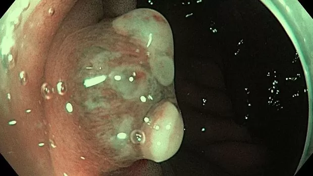 Выполнен пальцевой осмотр перед колоноскопией. На высоте пальца по задней стенке пальпируется плотное бугристое полиповидное образование до 0,5-0,8 см. На входе его не видно. Ну да ладно – на выходе же я его увижу!. При тотальной колоноскопии в восходящей и нисходящей кишке выявлено по одному гиперпластическому (гистологически) полипу 0,2 и 0,4 см – удалены. В прямой кишке: …ничего!!! Ну так же не может быть! Еще раз пальцевой осмотр – пальпируется. В результате колоноскопом я его нашел с третьего раза за складкой.