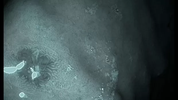 В режиме мультиспектральной визуализации VIST в с/3 тела желудка по большой кривизне определяется эпителиальное образование (тип 0-IIa), размером до 4 мм., рельеф слизистой и сосудистый рисунок позволил предположить НЭО желудка.