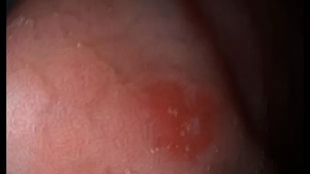При осмотре в белом свете и в режиме VIST: на фоне атрофического гастрита (тип 0-3 по Kimura-Takemoto) в теле желудка по всем стенкам определяются множественные эпителиальные образования (тип 0-Is).