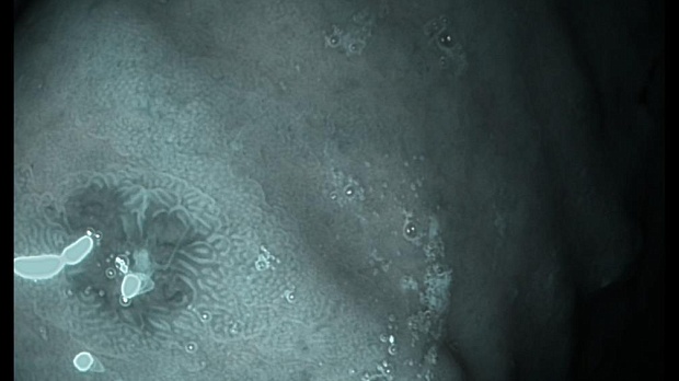 В режиме мультиспектральной визуализации VIST в с/3 тела желудка по большой кривизне определяется эпителиальное образование (тип 0-IIa), размером до 4 мм., рельеф слизистой и сосудистый рисунок позволил предположить НЭО желудка.