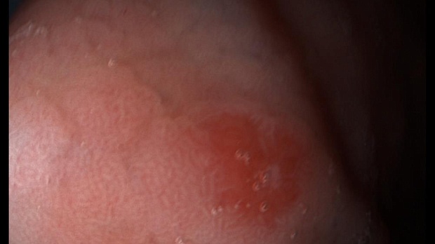 При осмотре в белом свете и в режиме VIST: на фоне атрофического гастрита (тип 0-3 по Kimura-Takemoto) в теле желудка по всем стенкам определяются множественные эпителиальные образования (тип 0-Is).