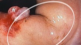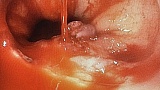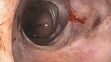 При осмотре просвета пищевода в ср/3 и н/3 визуализированы многочисленные рубцовые изменения, спиралевидной формы вдоль просвета. Расценены как фиброзные изменения слизистой на фоне хронического эрозивного эзофагита. В н/3 пищевода слизистая гиперемирована, визуализированы единичные линейные эрозии под фибрином с гематином, между собой не сливаются, размером до 2х6 мм. По задней стенке визуализирован дефект слизистой, размером около 2х3 мм, с подтеканием свежей крови. Данная эндоскопическая картина была расценена как синдром Мэллори — Вейсса, для остановки кровотечения, с учетом беспокойного поведения пациента, решено выполнить инъекционный гемостаз. После инъекционного гемостаза получено активное струйное кровотечение.