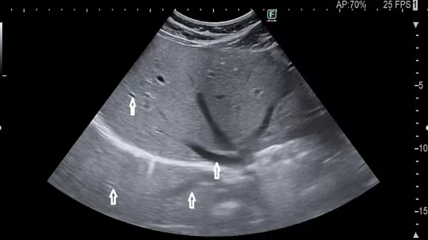 Рис.6 Анэхогенное поражение печени с тонкой гиперэхогенной стенкой с дистальным акустическим усилением, что подтверждает жидкостное содержимое и диагноз простой кисты печени.