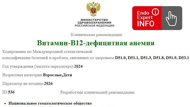 В12-дефицитная анемия (мегалобластная анемия, пернициозная анемия, болезнь Аддисона-Бирмера), характеризуется прогрессирующей гиперхромной, макроцитарной анемией, гиперсегментацией ядер нейтрофилов, мегалобластным эритропоэзом и морфологическими аномалиями других ростков кроветворения в костном мозге; в отличие от других анемий, В12-дефицитная анемия часто ассоциируется с развитием патологических психо-неврологических симптомов (фуникулярный миелоз) [1–4].