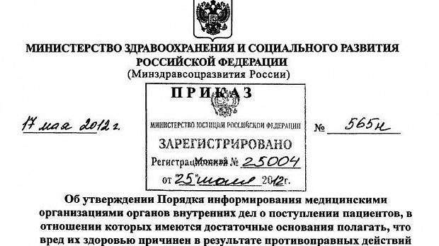 Порядок информмрования медицинскими организациями органов внутренних дел о поступлении пациентов, в отношении которых имеются достаточные основания полагать, что вред их здоровью причинен в результате противоправных действий