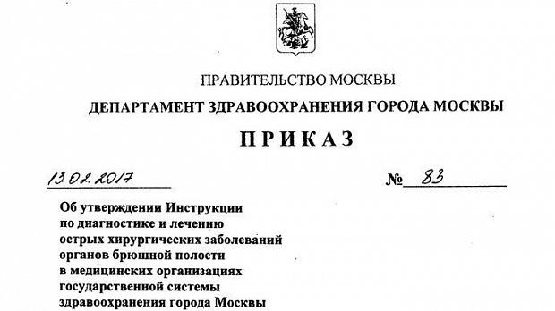 - от 13 апреля 2011 г. № 320 «О единой тактике диагностики и лечения острых хирургических заболеваний органов брюшной полости в лечебно-профилактических учреждениях Департамента здравоохранения города Москвы»;