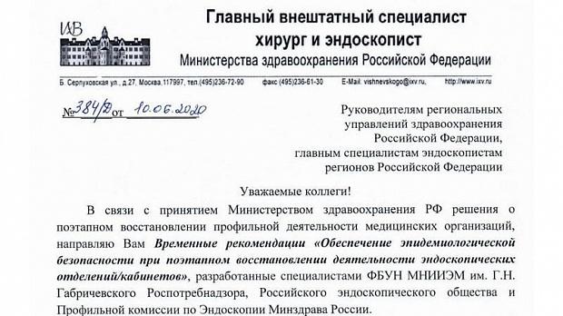 В связи с принятием Министерством здравоохранения РФ решения о поэтапном восстановлении профильной деятельности медицинских организаций, направляю Вам Временные рекомендации «Обеспечение эпидемиологической безопасности при поэтапном восстановлении деятельности эндоскопических отделений/кабинетов», разработанные специалистами ФБУН МНИИЭМ им. Г.Н. Габричевского Роспотребна дзора, Российского эндоскопического общества и Профильной комиссии по Эндоскопии Минздрава России.