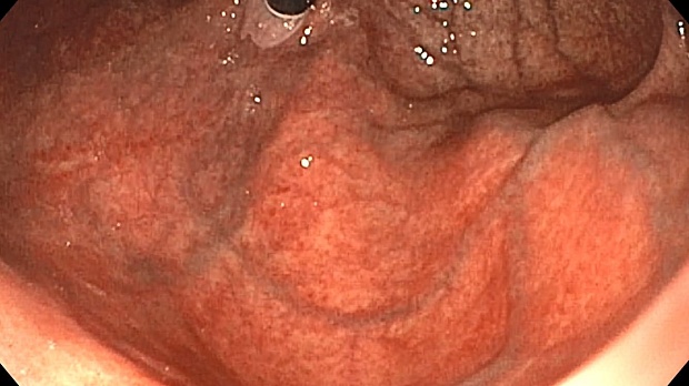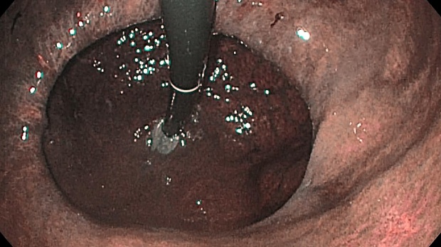 Краткое описание. При ретроградном осмотре пищеводно - желудочного перехода - хиатальное окно расширено, около 10 см; отмечается фиксация кардиального отдела в средостение около 10 см; кардиальный жом плотно обжимает тубус аппарата.