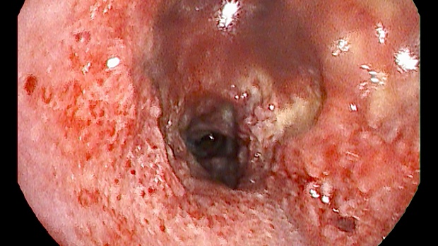 При осмотре правого главного бронха, верхнедолевого бронха, промежуточного бронха с переходом на среднедолевой и нижнедолевой бронх определяется идентичные изменения слизистой в виде гиперемии и отёка слизистой с сосудистыми вкраплениями и изъявлениями , множественная инфильтрация по типу полиповидных разрастаний с образованием язвенных дефектов покрытые детритом. Слизистая контактно кровоточит.