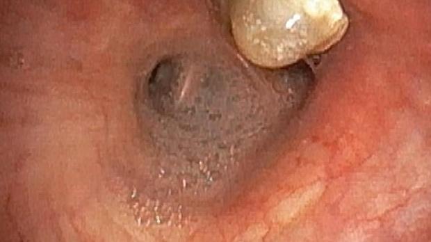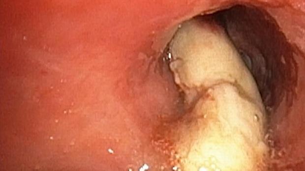 Левое бронхиальное дерево: начиная от средней трети верхнедолевого бронха до устья сегментарных бронхов верхней зоны по медиальной поверхности визуализируется инородное тело желтого цвета, размером 1.0х3.0 см в d, обтурирующее на 2/3 просвет сегментарных бронхов S1,2,3 далее для аппарата не проходим, устья S4,5 проходима. При инструментальной пальпации ткань мягко-эластичная. Половина инородного тела удалена. Отправлена на гистологию, цитологию.