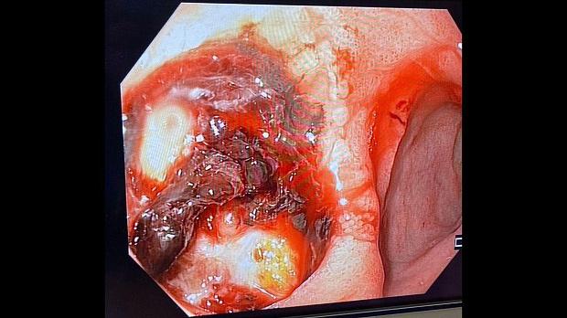 - у женщины 79 лет, с коморбидным статусом (мочекаменная болезнь, острый обструктивный пиелонефрит слева, сепсис, стентированные мочеточники, инсульт, правосторонняя гемиплегия, трахеостома, продленная ИВЛ, ожирение и т.д.) клиника желудочно-кишечного кровотечения (мелена, падение гемоглобина с 80 до 60 единиц)