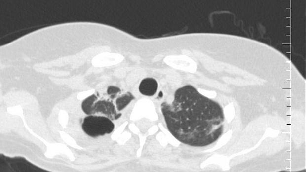 По данным Р-КТ органов грудной клетки: полость деструкции в нижней доле правого легкого. Выполнено дренирование плевральной полости справа. У пациентки – утечка воздуха по дренажу из плевральной полости.