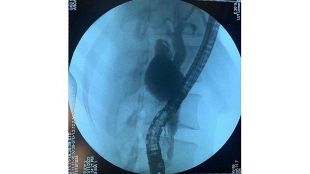 В срочном порядке пациент взят в операционную. В условиях интубационного наркоза в положении пациента на левом боку выполнена дуоденоскопия с последующей холангиографией.