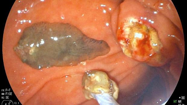 Эндоскопически: Бдс в типичном месте, интрамуральный отдел прослеживается на протяжении 1,5, отечен. Устье сокращается, отмечается поступление желчи с фрагментами чёрной слизи. Канюляция по проводнику катетером (паппилотомом) со второй попытки. При введении контраста, холедох на всём протяжении до 1,2см с неподвижным дефектом наполнения до 2,0 см в интрапанкреатической части. Паппилотомия до границ сфинктера Одди. При ревизии корзиной Дормиа извлечён гельминт до 4,0 см длиной, листовидной формы. Попытки захвата петлёй, щипцами без успеха, миграция организма в дистальные отделы. При инструментальной ревизии жёлчных протоков дополнительной информации не получено. Холедохоскопия не выполнялась, нет в наличии. Пациент консультрован инфекционистом, рекомендовано консервативное лечение противогельминтными препаратами, для окружающих безопасен. Клинический случай представлен сотрудником 1 ГКБ Н. И. Пирогова, Михалкиным А.В.