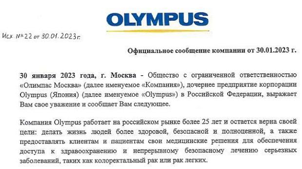 «Олимпас Москва» (далее именуемое «Компания»), дочернее предприятие корпорации Olympus (Япония) (далее именуемое «Olympus») в Российской Федерации, выражает Вам свое уважение и сообщает Вам следующее.