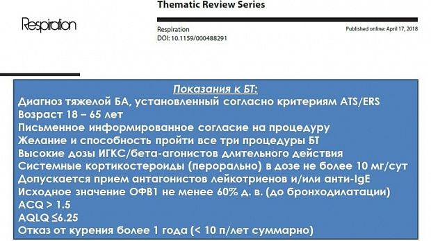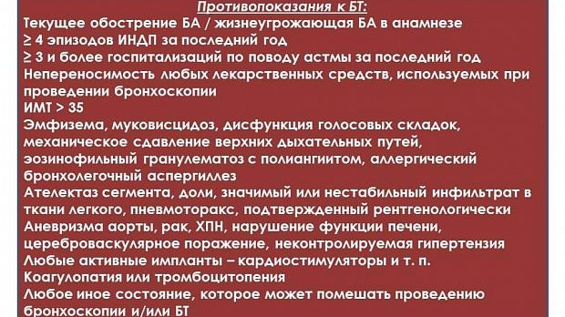1. Относительно противопоказаний к выполнению БТ, их как бы не больше, чем комбинации показаний к ней. Здесь я буду основываться на рекомендации группы экспертов, опубликованных в Respiration (https://www.ncbi.nlm.nih.gov/pubmed/29669351):