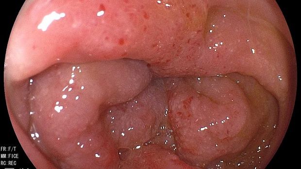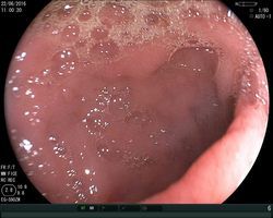 Эндоскопия выполнена 22.06.2016 - залуковичный отдел – просвет циркулярно сужен до 1.0см, слизистая гиперемирована, отечная, при инструментальной пальпации плотно-эластической консистенции. Papilla Vateri: втянут в отечные складки, дольчатой структуры обычных размеров и формы, желчь в ДПК поступает с примесью белесоватой жидкости (гной). Учитывая данные анамнеза, инструментальных методов исследований (КТ) у пациента можно предположить.