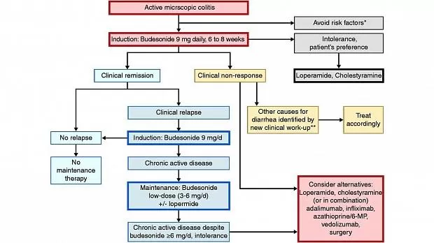 - Рекомендуемое лечение включает тиопурины, препараты против фактора некроза опухолей (анти-TNF) или ведолизумаб у пациентов с MК, состояние которых не отвечает на будесонид, чтобы вызвать и поддерживать клиническую ремиссию.