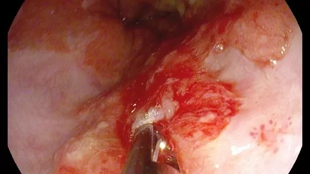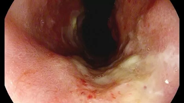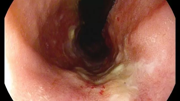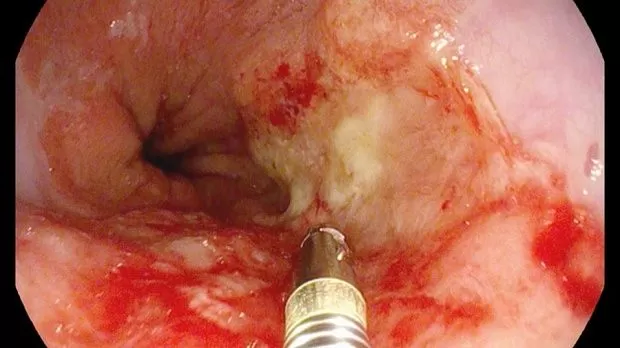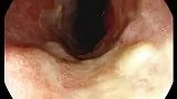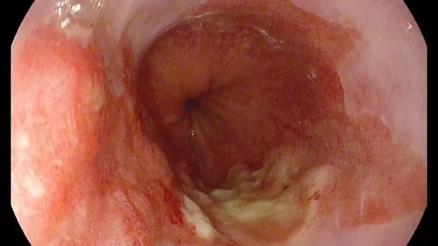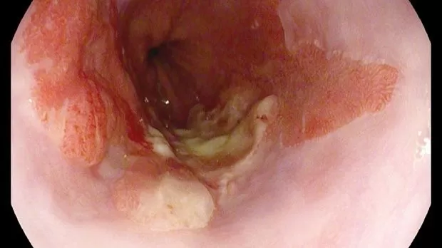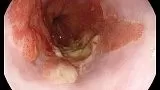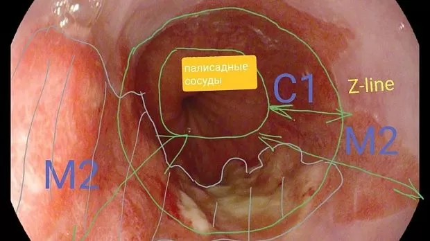 На фоне цилиндроклеточной метаплазии с циркулярным сегментов протяжённостью приблизительно 1 см( С1) и зубцами, максимальная длина которых приблизительно 2 см (М2) визуализируется площадка с чёткими границами ткани со стёртым паттерном, переходящая в изъязвление. Suspicio инфильтративно-язвенный c-r на фоне цилиндроклеточной метаплазии(С1М2).