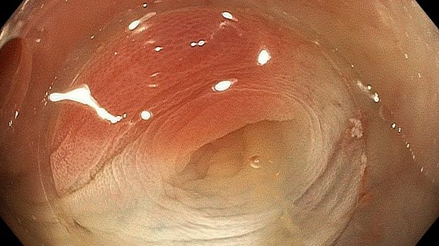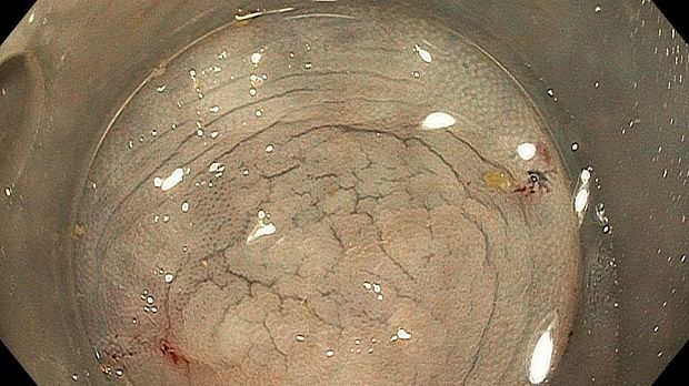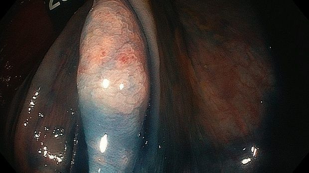 Видео случай. Комбинировання дифференциальная диагностика в случае инвертированного дивертикула. Сидячая зубчатая аденома была заподозрена в восходящей кишки с помощью колноскопии в белом свете и хромоскопии индигокармином. Инвертированный дивертикул был подтверждён при исследовании с дистальным колпачком, подслизистой инъекцией и хромоскопией уксусной кислотой.