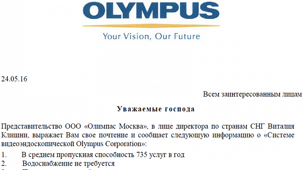 Представительство ООО «Олимпас Москва», в лице директора по странам СНГ Виталия Клишни, выражает Вам свое почтение и сообщает следующую информацию о «Системе видеоэндоскопической Olympus Corporation»:
