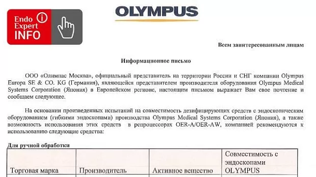 Насколько мы понимаем, в публичном доступе имеются предложения о поставке средств очистки и дезинфекции для оборудования OLYMPUS производителей, не входящих в одну группу лиц с OLYМPUS_ или не прошедших испытания на совместимость с оборудованием OLYМPUS. ООО «Олимпас Москва» не обладает информацией в отношении материала, качества и совместимости, не может гарантировать надлежащее функционирование оборудования OLYМPUS при их использовании и потому не рекомендует их использование.