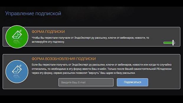 • Форма возобновления подписки (Если Вы перестали получать от ЭндоЭксперт.ру рассылки, ключи от вебинаров, новости или когда-то случайно отписались, то необходимо в эту форму ввести Ваш е-мейл. Только после Вашей самостоятельной РЕподписки через эту форму, сервис рассылок позволит "вернуть" Ваш адрес в базу рассылки.)
