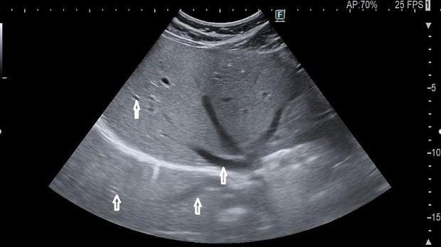 Рис.5 Множественные гиперэхогенные камни желчного пузыря с дистальной акустической тенью