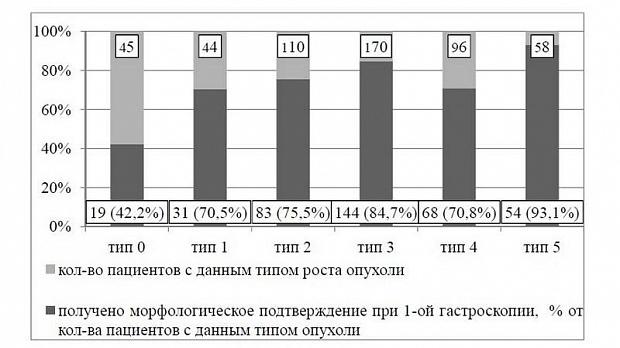 По данным многих авторов (Соколов Л.К., 1971; Мельников Р.А., 1973; Kabayachi et. al., 1970) морфологический анализ биопсийного материала позволяет диагностировать рак желудка в 95-100%. Однако, как было замечено P.Hermanek (1973), ошибки щипцовой биопсии достигают 8-60%. К причинам, обуславливающим ошибочные результаты при исследовании биопсийного материала, относятся: неверный выбор участка для забора материала, взятие недостаточного количества фрагментов ткани, отсутствие подробного описания мест забора материала, предполагаемого диагноза и клинических проявлений заболевания. J.Deutsch (1999) утверждал, что при биопсии, выполненной из одной точки «язвы» желудка, подозрительной на ее злокачественный генез, вероятность постановки правильного диагноза составляет 70%, при биопсии в 8 точках эта вероятность повышается до 95 – 99%.