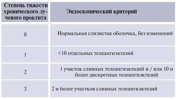 Для оценки степени тяжести поражения слизистой оболочки прямой кишки K.D. Chi была разработана система классификации ХЛП с учетом распространенности и степени выраженности телеангиэктазий — Rectal Telangiectasia Density Grading Scale. Применение шкалы Rectal Telangiectasia Density подразумевает оценку количества телеангиэктазий на слизистой оболочке прямой кишки с градацией от 0 до 3 (табл. 2).