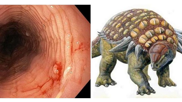 Рисунок 12. Изменения поверхности слизистой оболочки пищевода по типу «спины анкилозавра» при эозинофильном эзофагите. А) Эндофотография пищевода. Б) Реконструкция внешнего вида анкилозавра.