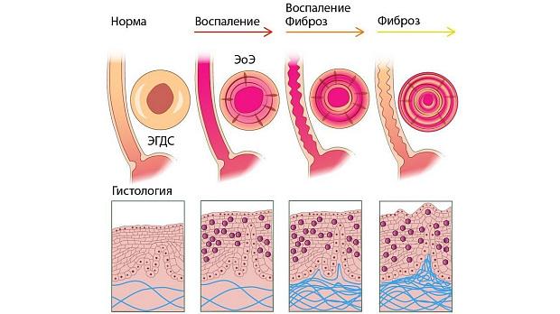 Ключевым методом диагностики ЭоЭ является ЭГДС с проведением множественной биопсии. На ЭГДС у больных с ЭоЭ обнаруживаются признаки активного воспалительного процесса на всем протяжении пищевода: отек и ранимость слизистой оболочки пищевода, белесый экссудат (эозинофильные микроабсцессы), линейные продольные борозды (рисунок 1). У взрослых больных ЭоЭ в дополнение к вышеперечисленным признакам нередко обнаруживаются изменения, отражающие развитие подслизистого фиброза: множественные концентрические кольца («трахеевидный» или «кошачий» пищевод), стриктуры и сужения пищевода [11-16].