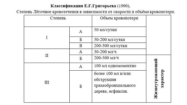 Степень кровопотери при Лёгочном кровотечении в зависимости от скорости и объёма кровопотери.