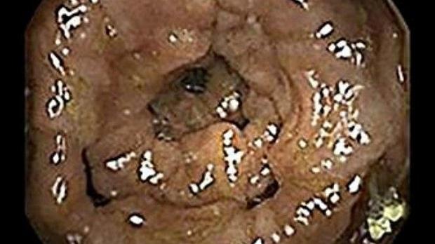 При колоноскопии выявлены обширные варикозные изменения во всей толстой кишке и терминальной подвздошной кишке со стигматами возможного кровотечения. Допплерография не выявила изменений со стороны вен печени, максимальный диаметр воротной вены составлял 12 мм.