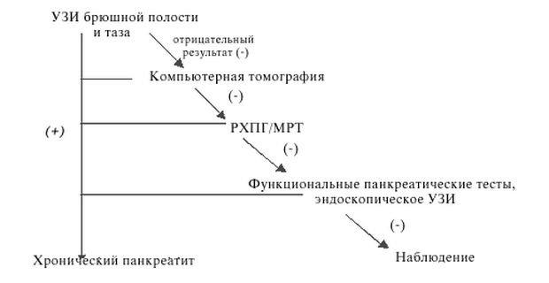 Из-за риска развития панкреатита в результате выполнения РХПГ эта диагностическая процедура должна применяться только когда неинвазивные исследования являются малоинформативными. Новые, более современные виды исследований, как ядерно-резонансная холангиопанкреатография и эндоскопическое ультразвуковое исследование становятся все более популярными. Если с использованием всех этих визуализирующих исследований не удается подтвердить диагноз, то может быть выполнено тестирование функции поджелудочной железы со стимуляцией секретином или ХК [10]. Диагностический алгоритм приведен на рисунке 4.