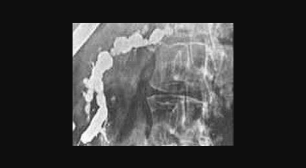 Амилаза и липаза сыворотки может соответствовать норме или быть незначительно повышена. У 5-10 % пациентов с хроническим панкреатитом компрессия дистальной части общего желчного протока ведет к увеличению билирубина сыворотки и щелочной фосфотазы. Мальабсорбция жира ведет к увеличению его экскреции с калом (более 7 грамм в день). Выявление панкреатических кальцификатов при рентгенографии, УЗИ или компьютерной томографии является диагностическим критерием хронического панкреатита. Эти кальцификаты обнаруживаются в примерно 25-60 % всех случаев хронического алкогольного панкреатита и у 35-80 % пациентов с панкреатитом другой этиологии. Компьютерная томография может также выявить локальное увеличение размеров поджелудочной железы, ее атрофию, расширение панкреатического протока или псевдокисту. РХПГ является наиболее чувствительным и специфическим визуализирующим исследованием в диагностике хронического панкреатита (рис. 3).