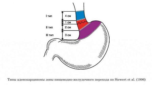Типы аденокарциномы проксимального отдела желудка по J. R. Siewert et al. (1996)