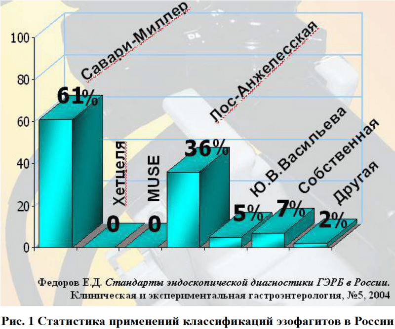 В 2004 году в нашей стране было проведено исследование по изучению статистики применения классификций рефлюкс-эзофагитов. По данным этого исследования в России, как и во всем мире, отдается предпочтение классификации Савари-Миллера61%) и Лос-Анджелесской классификации (36%). Классификация MUSE и классификация Хетцеля-Дента не используются вовсе, но в 14 % используются классификации, созданные в России и получившие некоторую известность внутри страны (рис.№1).