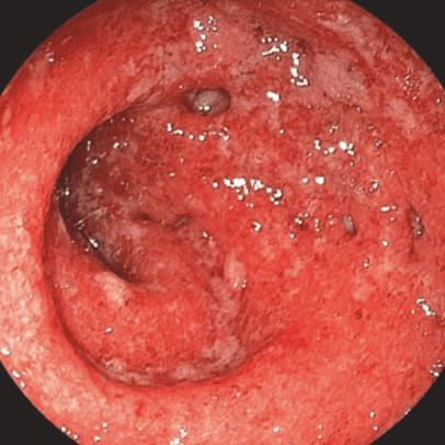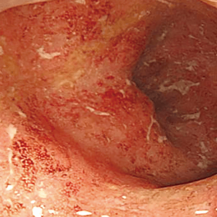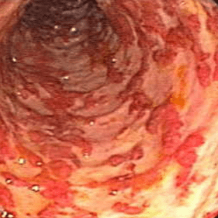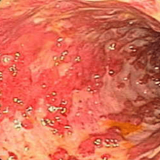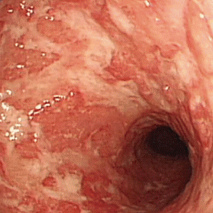 Эндоскопически сверхтяжелая форма язвенного колита характеризуется глубокими (до мышечного слоя) обширными язвенными дефектами, окруженными инфильтрированной слизистой оболочкой. Воспалительный процесс может быть настолько выраженным, что слизистая оболочка может быть представлена сплошной язвенной поверхностью с островками инфильтрированной слизистой оболочки.