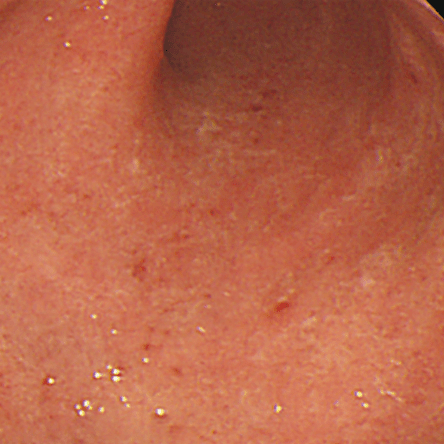 Легкая гиперемия, смазанный сосудистый рисунок. Легкая контактная ранимость