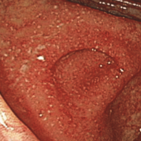 Выраженная гиперемия, отсутствие сосудистого рисунка, умеренная контактная ранимость, эрозии
