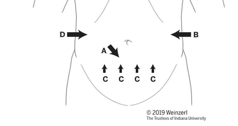 Прохождение левосторонней паховой грыжи легко решается путем погружения грыжи вручную перед процедурой и удержанием руки над грыжей в брюшной стенке, чтобы предотвратить ее образование вновь. Как только наконечник инструмента пройдет сигмовидную кишку, проблема решена.