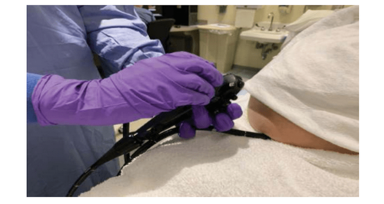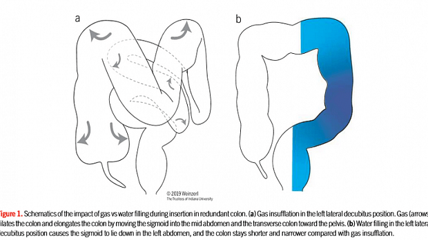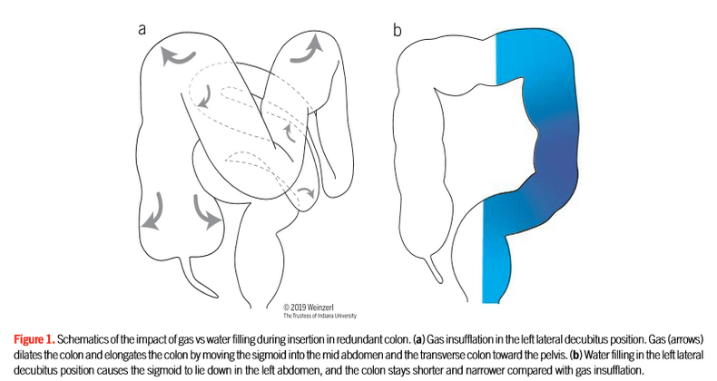Наиболее важным техническим шагом в удлиненной кишке является заполнение кишки водой, а не газом. Нужно перекрыть газ и заполнять кишечник только водой. Нет правила, сколько воды нужно использовать, и нет предела объема воды. По крайней мере, должно быть достаточное количество воды, чтобы увидеть просвет. Если подготовка является неадекватной, выполните обмен воды по мере необходимости, чтобы увидеть направление просвета. При обнаружении газовых карманов они удаляются с помощью аспирации. Заполнение водой делает толстую кишку короткой, что крайне важно для удлиненной кишки.