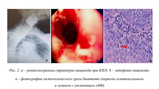Рис. 2: а – рентгенограмма стриктуры пищевода при КПЛ; б – эндофото пищевода; в – фотография гистологического среза биоптата (окраска гематоксилином и эозином с увеличением х400)