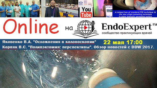The beginning at 17-00 (+ 2GMT, Kyiv). Russian. You can roam and hear the live webinar on endoscopy. Where we all together will consider such topics: the report of VA Yakovenko. "Complications on colonoscopy" and the latest news from Chicago from Korpyak VS "Polypectomy: perspectives"
