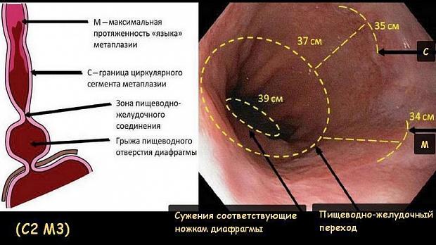 По Пражской классификации в сантиметрах указывается длина циркулярного цилиндроклеточного сегмента — «С» и максимальная длина «языков» метаплазии — «М».