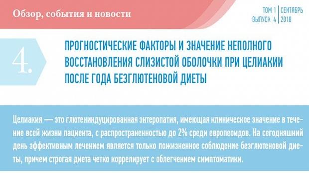 Целиакия — это глютениндуцированная энтеропатия, имеющая клиническое значение в течение всей жизни пациента, имеет распространенность на Кавказе до 2%. На сегодняшний день эффективным лечением является только пожизненное соблюдение безглютеновой диеты, причем строгая диета четко коррелирует с облегчением симптоматики. Для постановки диагноза необходимо подтверждение биопсией глютениндуцированного повреждения слизистой оболочки тонкой кишки и гиперплазии крипт. Современные рекомендации несколько противоречивы относительно того, следует ли повторять биопсию после года диетического лечения. Основными причинами рутинной последующей биопсии являются мониторинг гистологического восстановления и соблюдения диеты, а также исключение серьезных осложнений, таких как рефрактерная целиакия у пациентов (0,3%), не поддающихся лечению.