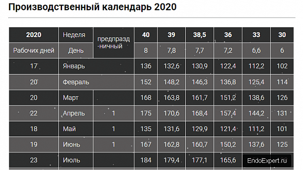 В производственном календаре содержится информация о количестве всех рабочих, нерабочих, предпраздничных, выходных и праздничных дней, норме рабочего времени в текущем (2020) году.