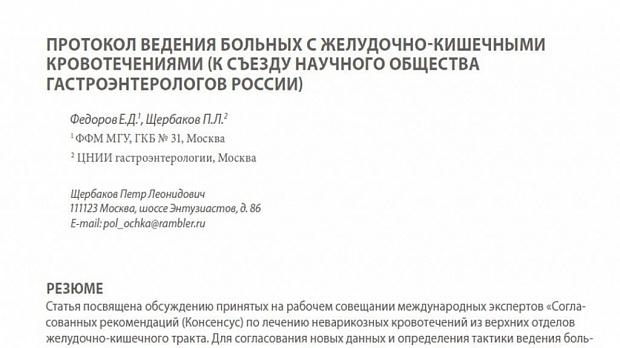 Paper is devoted to the discussion made at a workshop of international experts agreed recommendations (Consensus) for the treatment of bleeding of the upper gastrointestinal tract. In order to accommodate new data and determine the tactics of patients with gastrointestinal bleeding (International Consensus Upper Gastrointestinal Bleeding Conference Group).